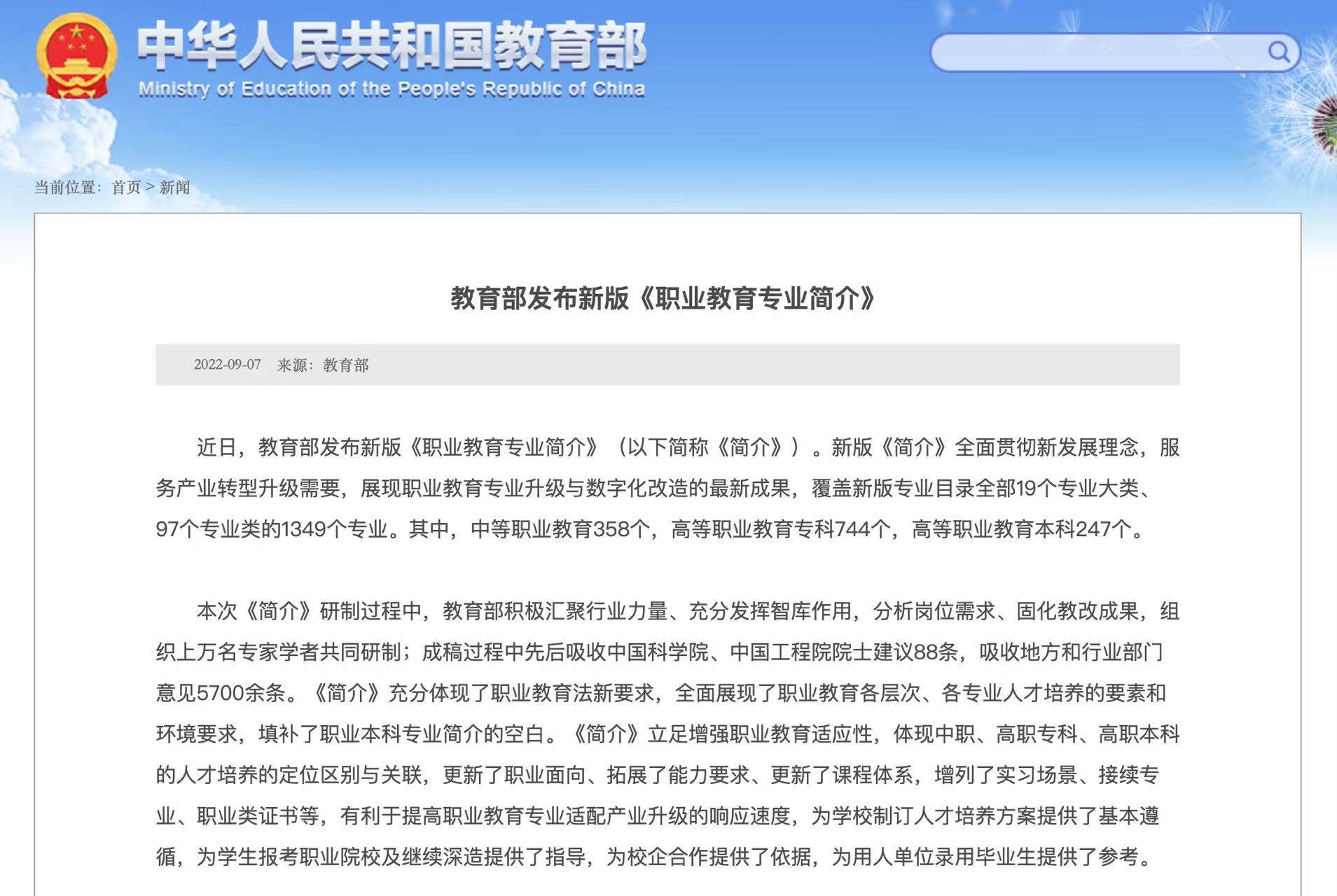 日前,教育部發(fā)布新版《職業(yè)教育專業(yè)簡介》(以下簡稱《簡介》),新版《簡介》全面貫徹新發(fā)展理念,展現(xiàn)職業(yè)教育專業(yè)升級與數(shù)字化改造的最新成果,覆蓋新版專業(yè)目錄全部19個專業(yè)大類、97個專業(yè)類的1349個專業(yè)。